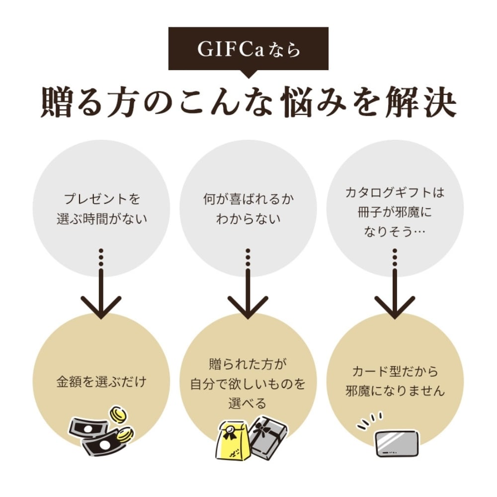 ギフカはギフトカードを受け取られた方が、ネット上の「GIFCa商品交換サイト」を利用して贈られたポイントを使って、自由に商品交換ができる新しいコンセプトの贈り物です。