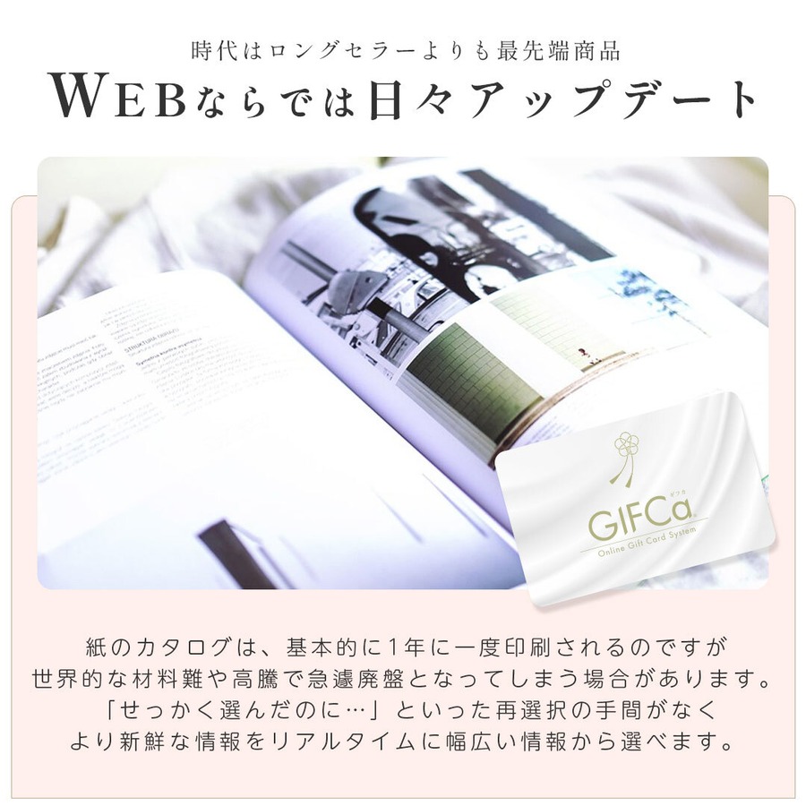 ギフカはギフトカードを受け取られた方が、ネット上の「GIFCa商品交換サイト」を利用して贈られたポイントを使って、自由に商品交換ができる新しいコンセプトの贈り物です。