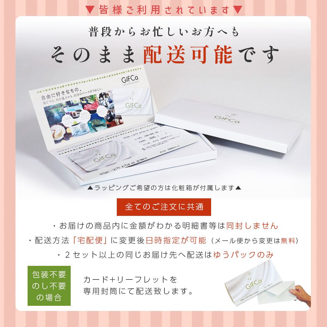 ギフカはギフトカードを受け取られた方が、ネット上の「GIFCa商品交換サイト」を利用して贈られたポイントを使って、自由に商品交換ができる新しいコンセプトの贈り物です。
