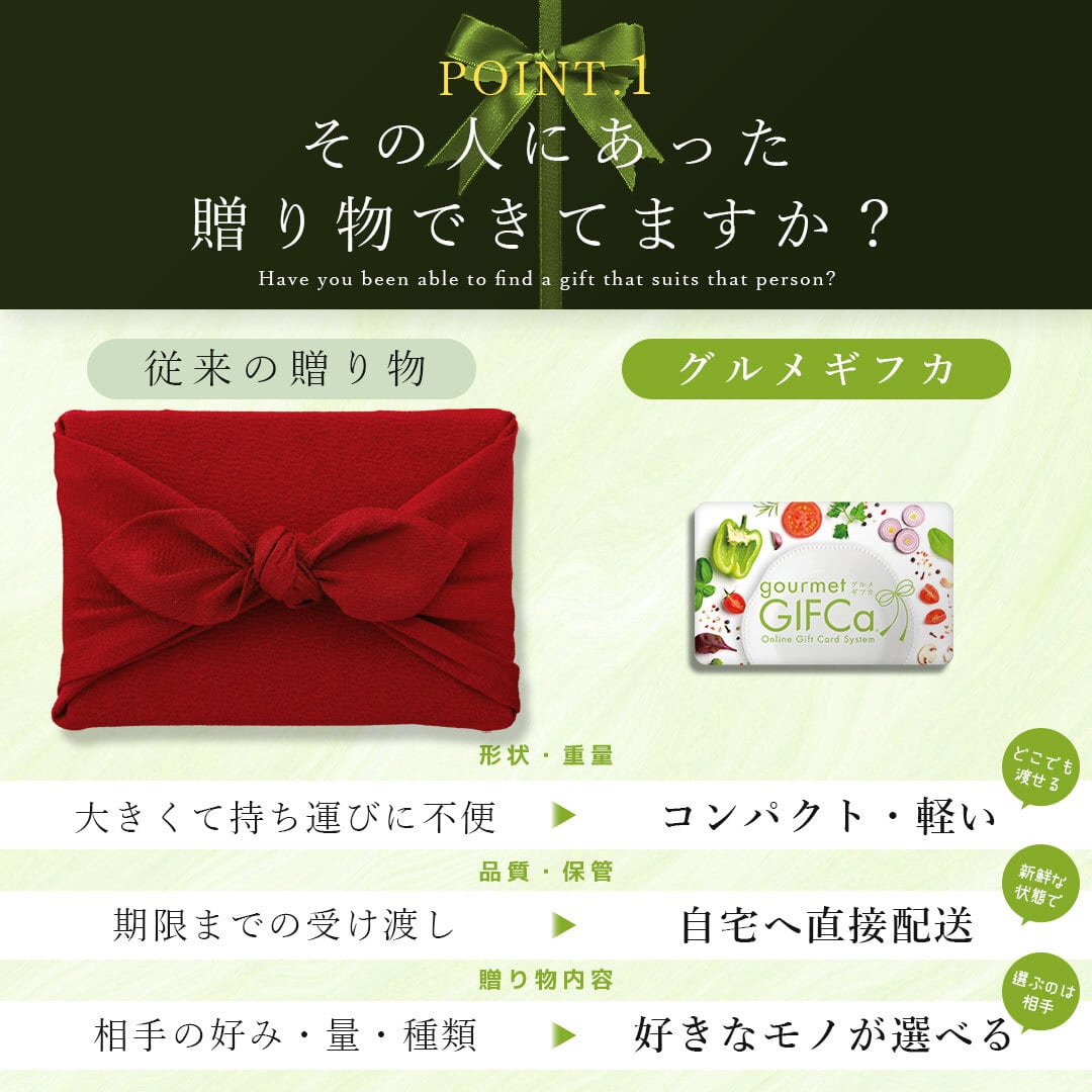 ギフカはギフトカードを受け取られた方が、ネット上の「gourmet GIFCa商品交換サイト」を利用して贈られたポイントを使って、自由に商品交換ができる新しいコンセプトの贈り物です。
