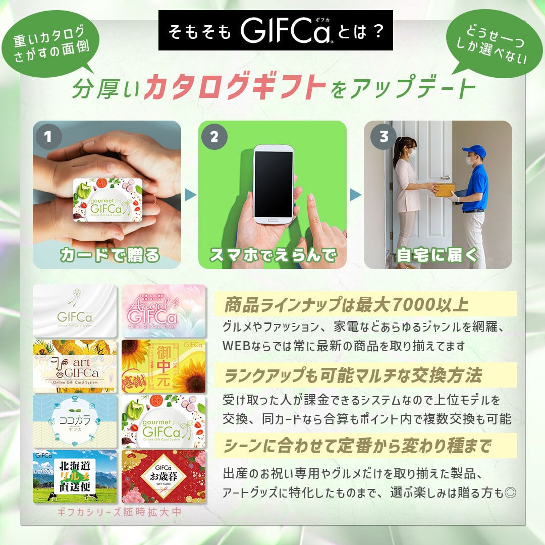 ギフカはギフトカードを受け取られた方が、ネット上の「gourmet GIFCa商品交換サイト」を利用して贈られたポイントを使って、自由に商品交換ができる新しいコンセプトの贈り物です。