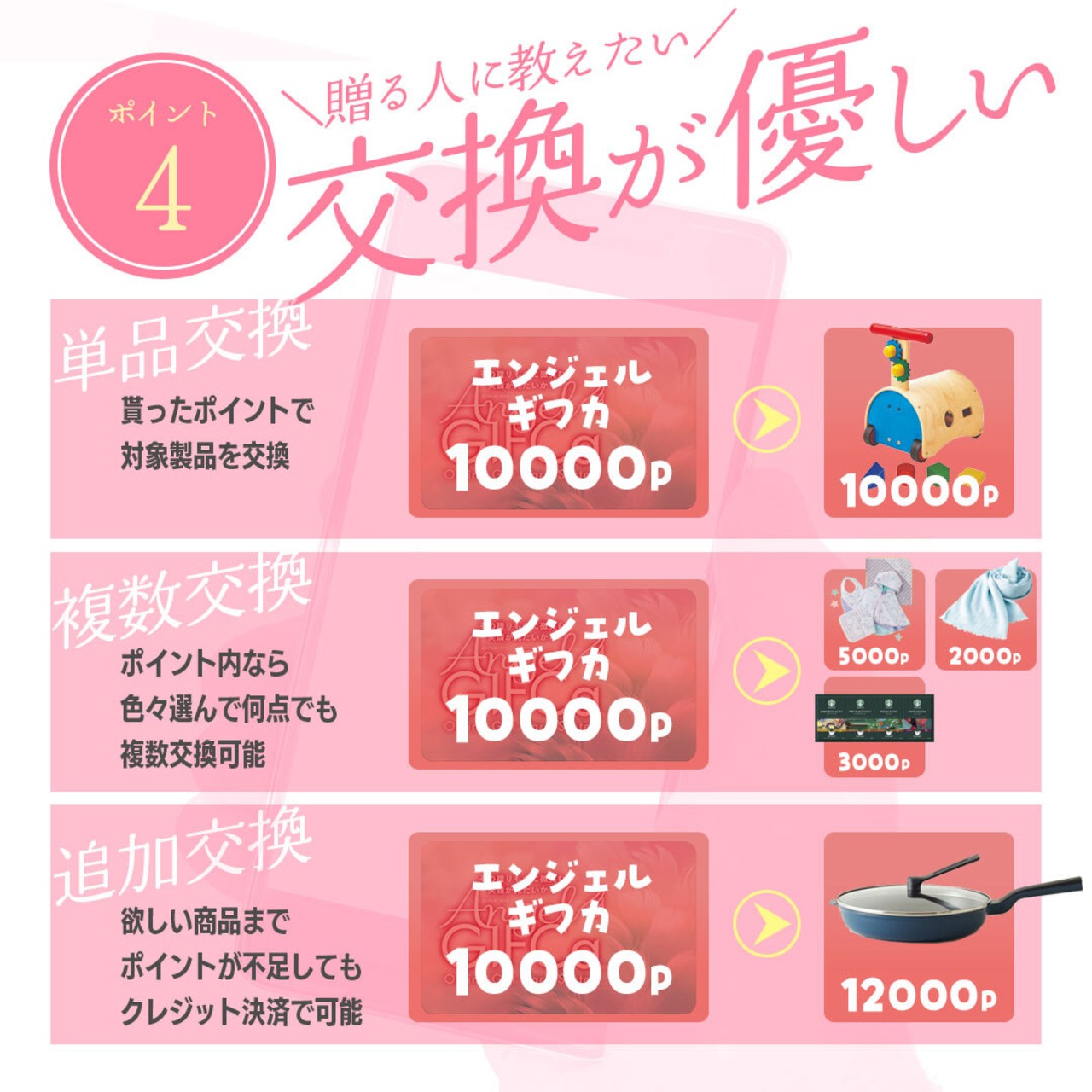 ギフカはギフトカードを受け取られた方が、ネット上の「Angel GIFCa商品交換サイト」を利用して贈られたポイントを使って、自由に商品交換ができる新しいコンセプトの贈り物です。